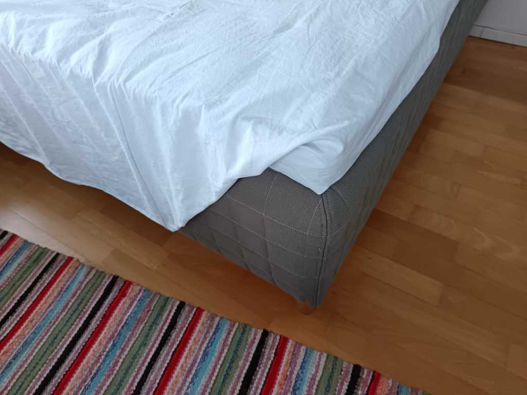 Tuossa viimeisessä kuvassa näkyy myös uusi sauma – hyvin toimii. Kahdessa yhden hengen lakanassa on niin paljon leveyttä, että lakana riittää yhä oikein mainiosti sänkyyn, vaikka otin sen pituudesta palan pois. Kauniita unia!