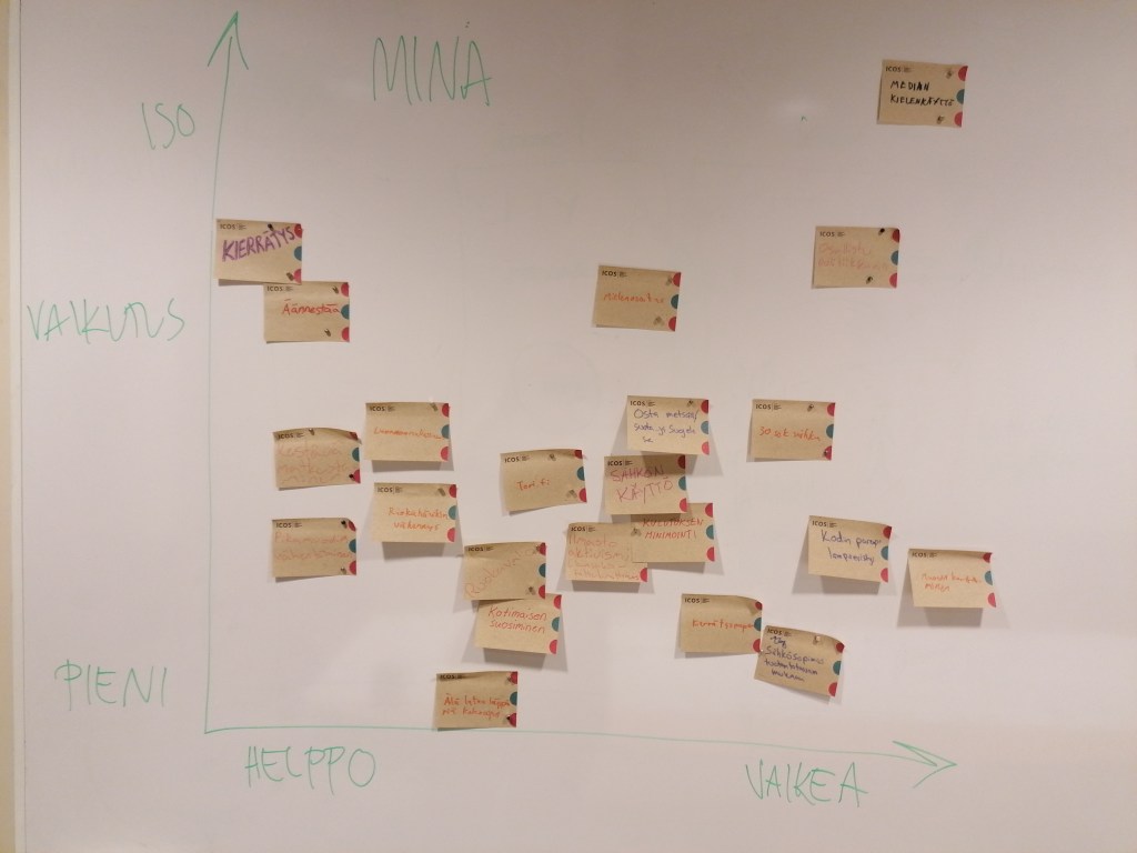 Tämän jälkeen on tärkeää näyttää, että useimmilla meistä on jo työkaluja vyöllä ilmaston muutoksen torjuntaan nähden. Voimme tehdä asioille jotain. Ymmärrän hyvin, että yksilön tasolla vaikutukset ovat vähäiset, mutta on tärkeää tuntea voivansa vaikuttaa asioihin ja olla osa muutosta. Voimme myös pyrkiä vaikuttamaan isoihin linjoihin esim. äänestämällä. Tai sitten jotenkin toisin, vaikka osallistumalla mielenosoituksiin – sinä päätät. Kun tunnelma on käynyt tunnekeskustelun jälkeen melko hartaaksi, jaetaan osallistujille tarralappuja, joihin he voivat vapaasti kirjoittaa kaikki ajatukset, mitä mieleen juolahtaa. Usein työskentely tapahtuu nelikentän avulla, jossa vasemmalta oikealle pohditaan toimen vaikeutta tai helppoutta ja ylhäältä alas yhteisöllisyyttä tai yksilöllisyyttä.